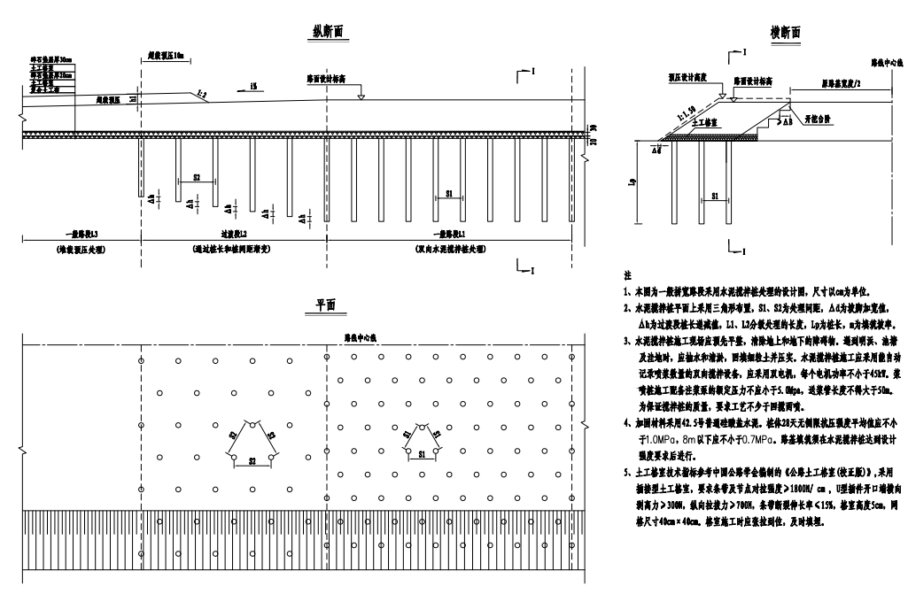 此次路基水泥搅拌桩“首钻”位于项目院桥连接线LK2+580~LK2+600处,水泥搅拌桩处路基宽度为24.49m,首件水泥搅拌桩根数为10根,长度为85m,处理间距1.5m,平均深度8.5m。工艺要求不少于四搅两喷,路基下水泥搅拌桩采用正三角形布设,桩径均为70cm,且桩体每延米水泥用量不小于130Kg,水泥采用P.042.5普通硅酸盐水泥。